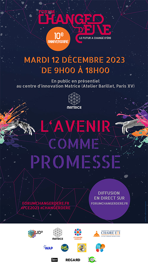 À PROPOS DU FCE : Créé en 2013 à la Cité des sciences et de l’industrie de La Villette (Paris) par Véronique Anger-de Friberg avec le soutien amical du scientifique Joël de Rosnay, Forum Changer d’Ère interroge & informe sur les grands défis de la modernité et les effets sociétaux des mutations engendrées par la révolution anthropologique. Alors que notre capacité à nous projeter semble en panne, FCE entend continuer à porter loin son regard multidisciplinaire et prospectif sur les nouveaux espaces de savoir & les grands enjeux qui fondent les sociétés de demain. En marge de ce rendez-vous majeur de la prospective sociétale à la croisée des disciplines, des expériences et des générations, L'Émission Changer d'Ère poursuit le dialogue tout au long de l'année à l’heure où les polémiques et l’absence de nuance nuisent trop souvent au débat.